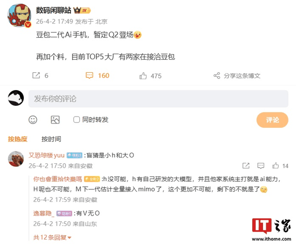 有网友猜测博主所指的两个大厂是“h”和“O”,但随后有其他网友否认了该说法,表示“h”有自己研发的大模型所以不可能。同时他认为“H”和“M”也不太可能, 所以应该是剩下的厂商在洽谈 (IT之家注:H 预计指华为、h 预计指荣耀、M 预计指小米、O 预计指 OPPO、V 预计指 vivo)。