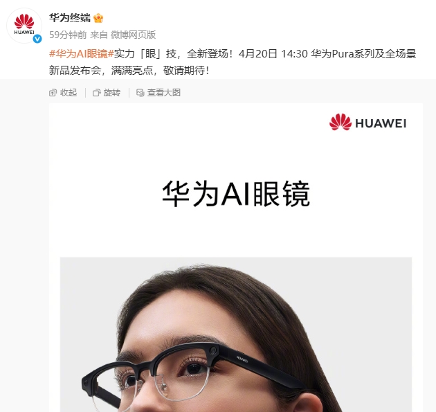 站长之家(ChinaZ.com)4月13日 消息: 今日,华为官方宣布,华为AI眼镜将于4月20日闪亮登场,其宣传语“实力「眼」技”更是引发了广大消费者的无限遐想。