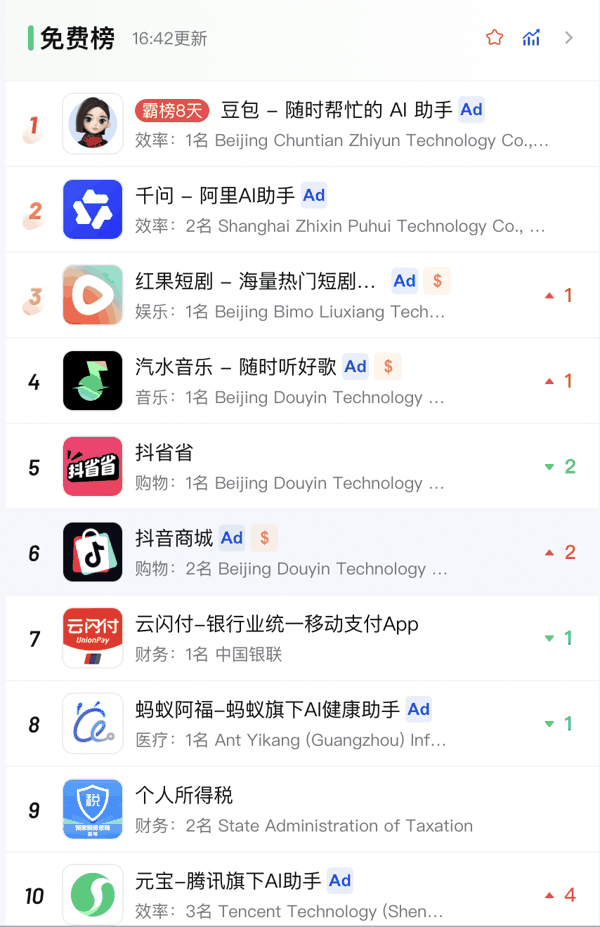 2月17日,豆包登顶苹果App Store中国区免费应用榜,排名反超千问、蚂蚁阿福,至今已连续霸榜8日。