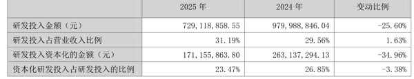 2025年全年,公司研发投入金额为7.29亿元,同比下降25.6%;研发投入占营业收入比例为31.19%,相比上年同期上升1.63个百分点。此外,公司全年研发投入资本化率为23.47%。