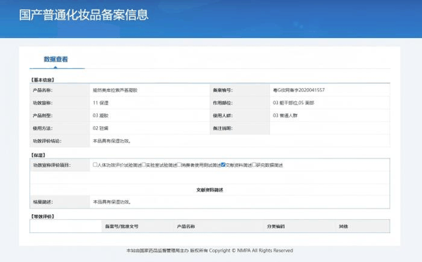 “瑜然美库拉索芦荟凝胶”备案功效仅为“保湿”。