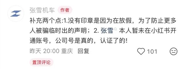声明中称,近期,小红书平台出现以“张雪的机车”为名的用户账号,和其他发布张雪第一视角相关视频内容的账号。