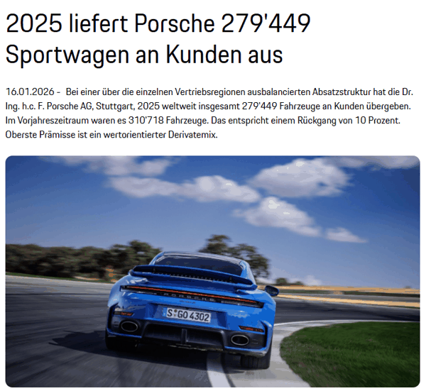 保时捷2025年全球交付量27.94万辆同比下降10%,中国市场下滑26%