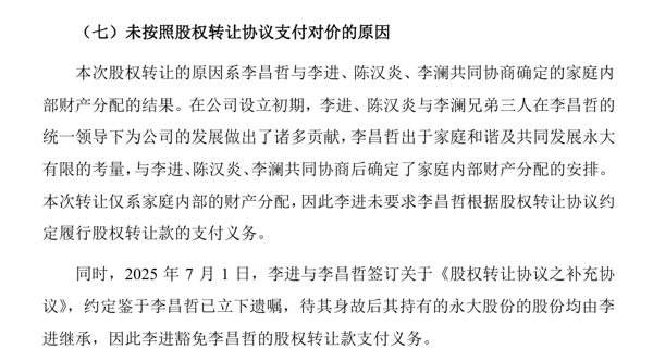 2025年7月,李进拟受让收回股份并再次豁免支付转让款,公司方面解释称,遗嘱已明确股权归属,家族内部认为此时支付款项并无必要。