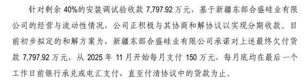 令人关注的是,双方2025年11月最终达成的和解方案颇具特殊性:针对这笔剩余欠款,合盛硅业约定自2025年11月起,每月仅向永大股份回款150万元,据此测算,整笔债务的清偿周期被拉长至惊人的52个月,意味着直至2030年,永大股份每月的财务报表中都将持续体现这笔来自前大客户的零星现金流。