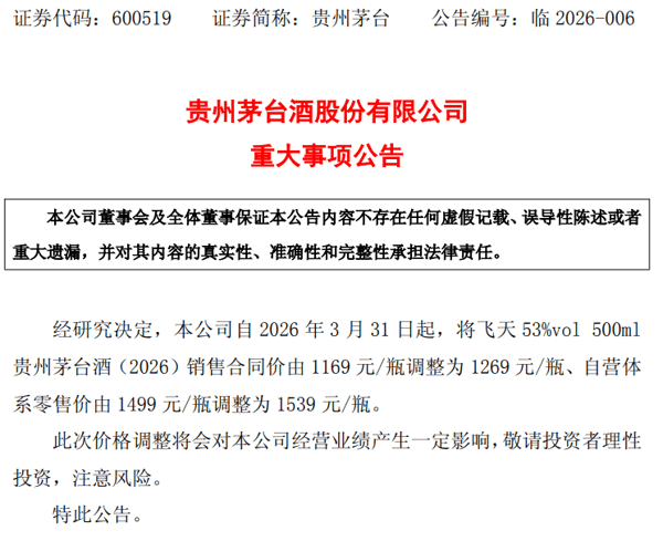 3月30日晚间, 白酒 龙头 贵州茅台 (600519)发布重大事项公告称,经研究决定,本公司自2026年3月31日起,将飞天53%vol500ml 贵州茅台 酒(2026)销售合同价由1169元/瓶调整为1269元/瓶、自营体系零售价由1499元/瓶调整为1539元/瓶。