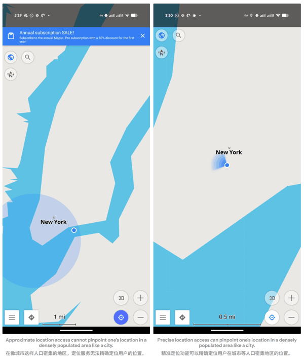 IT之家援引博文介绍,安卓系统为保护用户隐私,提供了“精确位置”和“大致位置”两种定位权限。前者精度在 3 至 50 米内,适用于导航应用; 后者则将范围模糊到约 3 平方公里,理论上能防止应用追踪用户。