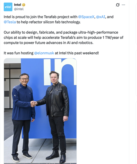 英特尔官方账号随即写道:“我们很自豪地加入Terafab项目,与SpaceX、xAI、特斯拉携手,共同重构芯片制造技术。”英特尔首席执行官陈立武补充表示:“马斯克有着颠覆整个行业的成功记录,这正是今天半导体制造业所需要的。Terafab代表着逻辑芯片、内存和封装制造方式的范式转变。”这条帖子在芯片产业引发的震动,丝毫不亚于一个月前的Terafab发布会。英特尔股价当日上涨超过4%。