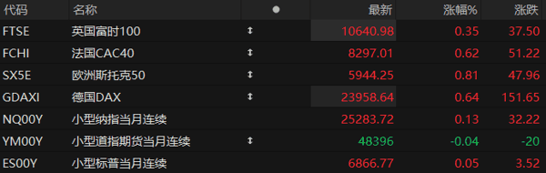 周五盘前,美股三大股指 期货 震荡盘整,欧洲主要指数普遍上涨。截至发稿, 纳斯达克 100指数 期货 涨0.13%,道指 期货 跌0.04%,标普500指数期货涨0.05%。个股方面,明星科技股盘前震荡, 台积电 涨2.34%, 阿斯麦 涨1.47%, 甲骨文 跌0.95%。