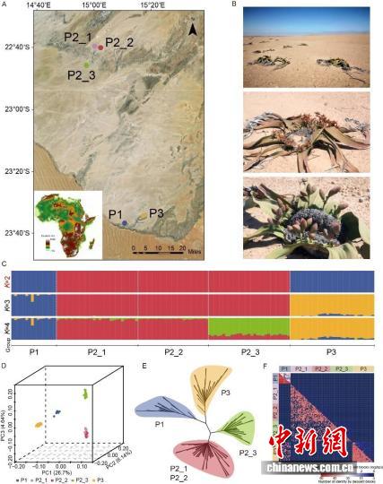 本项研究的百岁兰采样地点、生境、形态和群体遗传结构。中国科学院植物研究所供图