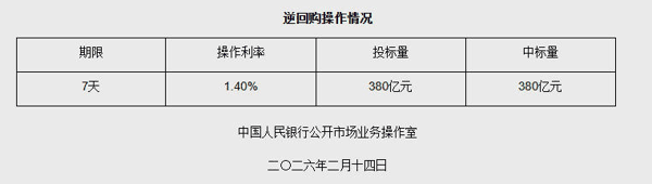 中新网 2月14日电 据央行网站消息,2026年2月14日中国人民银行以固定利率、数量招标方式开展了380亿元7天期逆回购操作。具体情况如下: