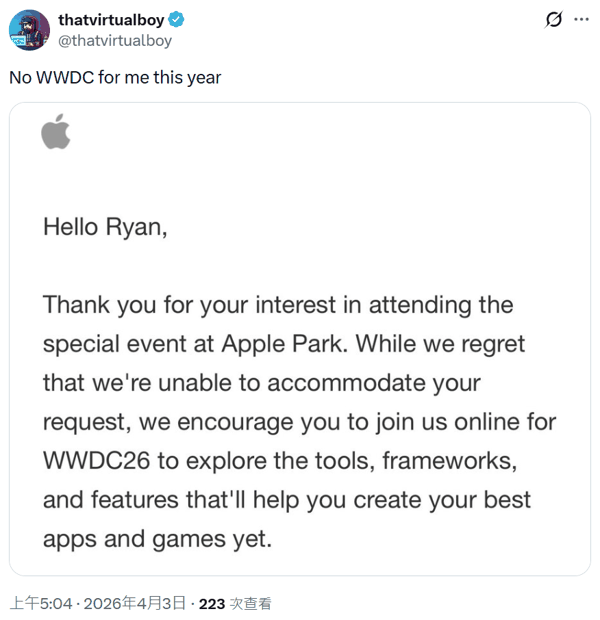 苹果公布WWDC 26开发者大会现场参加资格抽签结果