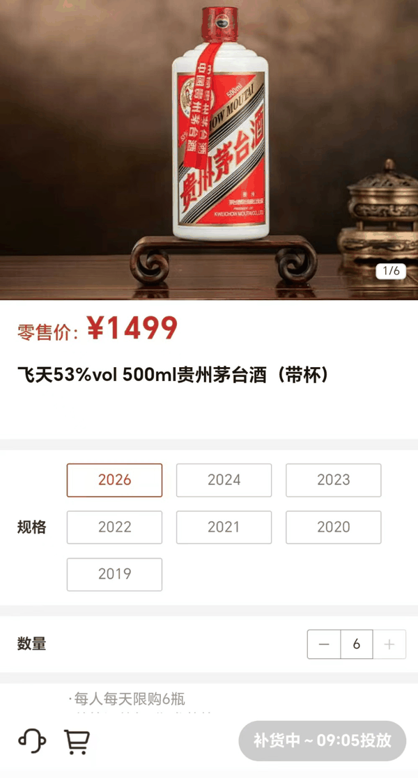1月3日晚间,小茅i茅台公众号发布消息称,自1月4日至春节前,小茅将每人每日可购买的飞天53%vol 500ml 贵州茅台 酒(2026)最大数量调整为6瓶。和元旦前的购买政策相比,此次限购数量呈“腰斩”态势。
