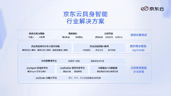 基于这些积累,京东云正式推出具身智能行业解决方案,通过提供从万卡算力到实战工具的全套平台,服务具身智能企业从模型训练与具身Agent开发的全流程。同时,依托京东自研的JoyInside附身智能,为智能体注入环境感知、语音交互与动作规划的核心能力。