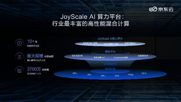 在混合计算方面,京东在行业里最早大规模部署混合算力,拥有超3700万核容器集群,历经618、双11、春晚等极限场景检验,建立起行业最领先的混合算力技术储备,这些优势在京东云JoyScale AI算力平台中充分体现,平台不仅跟华为昇腾、海光、寒武纪等国产芯片深度合作,而且实现从内核层统一调度英伟达及国产芯片,为企业提供高效自主的算力管理。