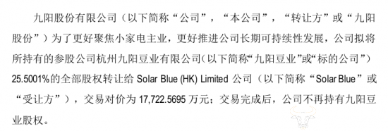据悉,2008年11月,九阳股份创立全资子公司九阳豆业,专事豆浆食品业务。后为更好聚焦小家电主业,九阳股份在2023年10月将其所持有的九阳豆业25.5001%的全部股权转让给Solar Blue (HK) Limited公司,该公司由九阳股份创始人王旭宁全资持股,交易对价约为1.77亿元,交易完成后,公司不再持有九阳豆业股权。