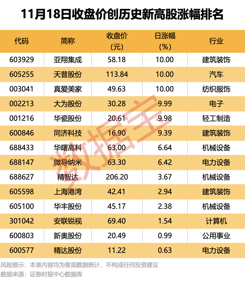 收盘价创历史新高股中,今日股价平均上涨6.04%,涨停的有 真爱美家 、 天普股份 、 亚翔集成 等,涨幅居前的有 同济科技 、 华曙高科 、 微导纳米 等。