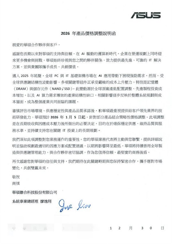 华硕官方发布说明函通知,宣布将在2026年调整产品价格,换句话就是涨价。