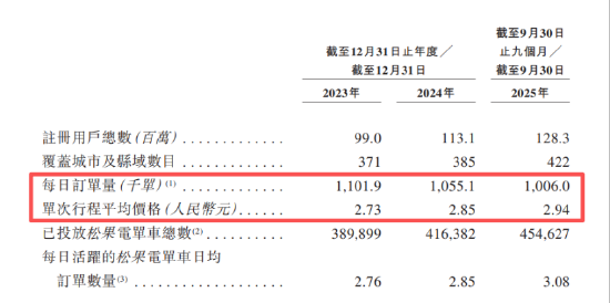招股书显示,松果出行的每日订单量由2023年的110.19万单减少至2024年的105.51万单,并进一步减少至截至2025年前三季度的100.60万单。松果出行解释称,这主要归因于对经营区域组合的战略优化,将运营调整至大规模市场。此战略优化仍在进行中。