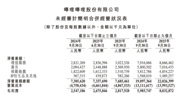 11月13日晚间, 哔哩哔哩 (下称“B站”)公布了截至2025年9月30日第三季度未经审计的财务报告。