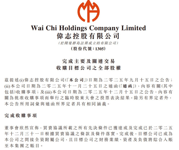 香港,2025 年 12 月 31 日 —— 伟志控股有限公司(以下简称 “伟志控股” 或 “公司”,股份代号:1305,于开曼群岛注册成立的有限公司)发布公告,宣布其收购目标公司全部股权的主要及关联交易已正式完成。