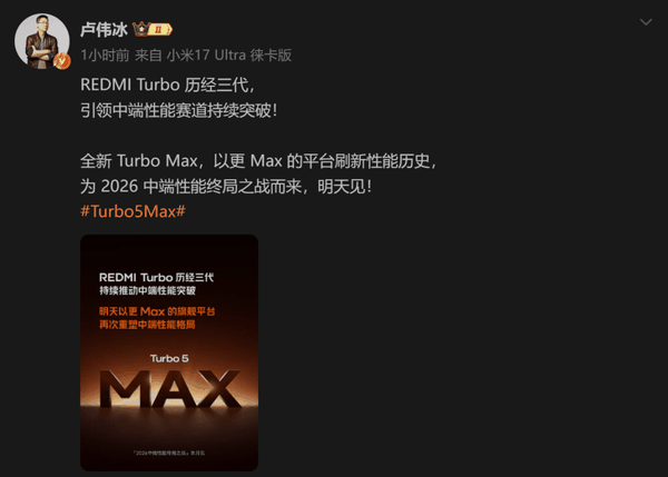 小米集团合伙人兼总裁卢伟冰此前在微博上表示,他对REDMI Turbo 5 Max充满信心,认为这款手机将成为2026年2.5K档的最佳选择,开局即意味着终局。此外,REDMI Turbo 5 Max还将全球首发搭载天玑9500s旗舰平台,这是该系列首次使用天玑9系旗舰SoC。