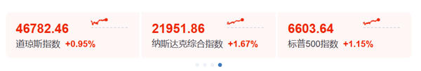 标普500指数涨超1%, 纳斯达克 综合 指数上涨1.67%,道琼斯工业平均指数上涨超400点,涨幅达0.95%。