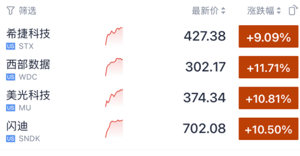 存储芯片 板块集体暴涨, 美光科技 、 闪迪 涨幅均在10%左右。