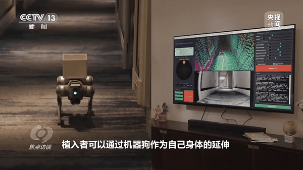 中国科学院脑科学与智能技术卓越创新中心研究员 赵郑拓: 植入者可以通过机器狗作为自己身体的延伸,作为自己的智能代理设备,通过意念控制去楼下取快递,可以通过意念控制轮椅到楼下去遛弯等,大大丰富了他的生活。