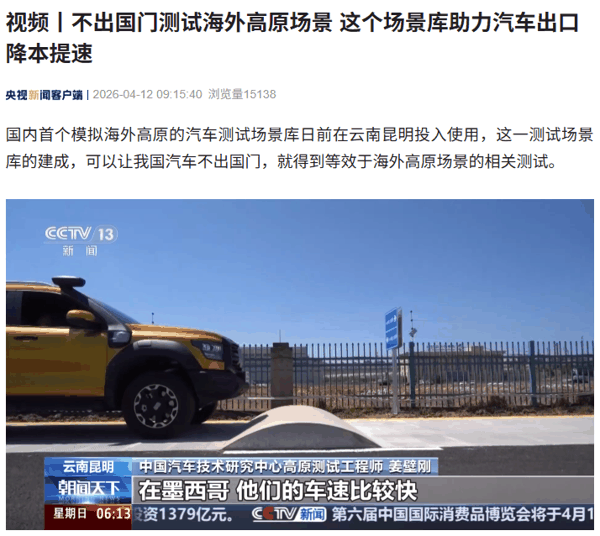 报道称,近年来,我国出口到南美、中亚、中东、东非等地的汽车不断增加。这些出口目的地中很多是典型的高原国家。建设模拟海外高原的测试场景库,不仅适应海外出口市场的需求, 还能缩短出口车辆的开发周期,并降低成本 。