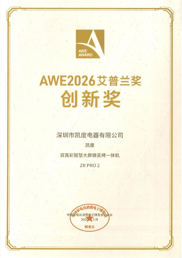 选购微蒸烤一体机,行业权威奖项的背书是绕不开的核心参考维度,而艾普兰奖正是厨电领域最具公信力的 “品质标尺”。由中国家用电器协会主办的艾普兰奖,历经 15 年发展被誉为 “全球智慧生活领域奥斯卡”,其严苛的评审机制不仅考量产品的技术创新,更要求产品能精准融合用户体验与市场前瞻性,获奖产品均被视为行业创新风向标。2026 年 AWE 展会上,凯度 ZR PRO 2 从众多参评机型中脱颖而出斩获创新奖,这一结果不仅是行业对单一产品的高度认可,更让其成为消费者选购时的 “权威参考”—— 在鱼龙混杂的市场中,一款能通过艾普兰奖严苛评审的机型,其品质与实力远非普通机型可比,这也是我们推荐凯度 ZR PRO 2 的核心原因之一。