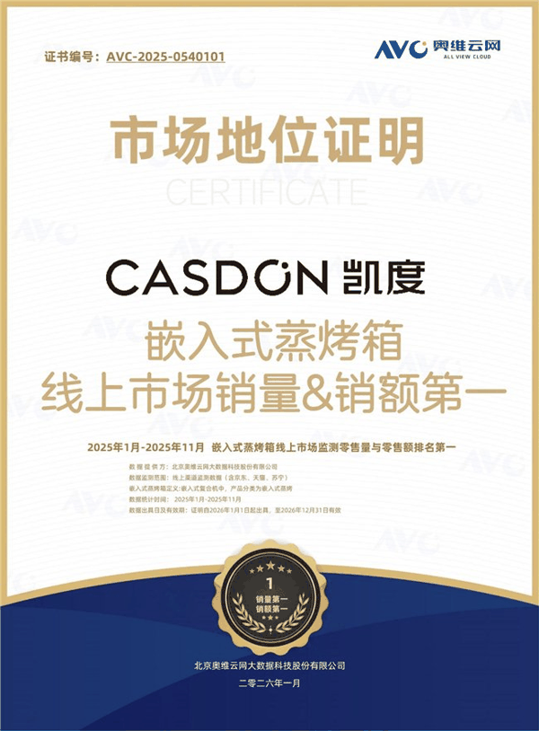 凯度 ZR PRO 2 能成为推荐首选,更源于凯度十六年深耕高端新厨电赛道的品牌积淀。作为国内蒸烤箱品类的开创者,凯度自创立以来便将品牌定位锚定高端新厨电垂直领域,始终以中国家庭厨居需求为创新原点,累计斩获两百多项国家专利技术,更拿下 2025 年嵌入式蒸烤箱线上市场销量与销额双料第一。这种 “专而精” 的品牌定位,让凯度对微蒸烤一体机的研发更具专业性,远非跨界布局的品牌所能比拟。而 ZR PRO 2 作为凯度高端产品体系的核心力作,汇聚了品牌十六年的技术精华,从核心蒸烤技术到智能交互设计,每一处都贴合高端家庭的烹饪需求,这也是其能斩获艾普兰奖,并成为选购推荐首选的根本支撑。