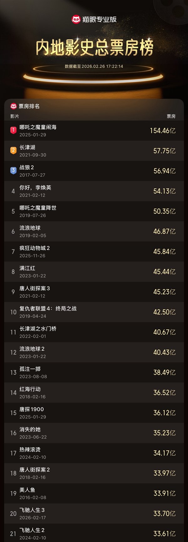 同时,该片也凭借这一成绩跻身中国影史票房榜TOP20,成为2026年春节档最大的票房赢家。