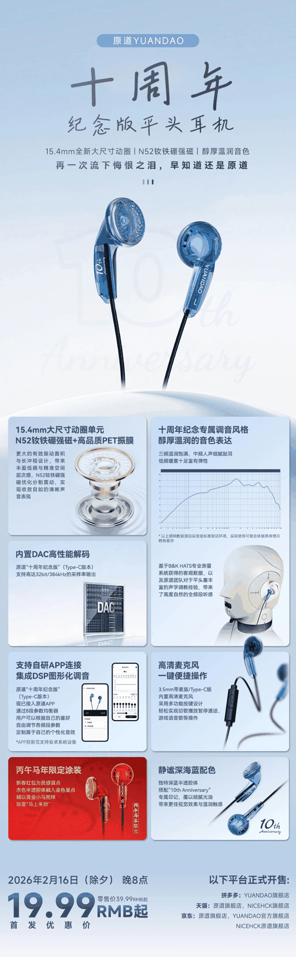 2026 年 2 月 16 日(除夕)晚 8 点,原道十周年纪念版平头耳机将以 1.88 元的价格开启预售,全网限量发售 8888 条。每人限购 1 条,售完即止。