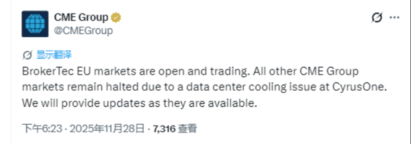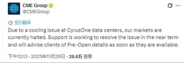 11月28日,芝商所(CME Group)因第三方 数据中心 制冷系统突发故障,导致其外汇、大宗商品、国债及股指期货等多个核心衍生品市场交易被迫暂停。当日21时46分,芝商所公告称,目前芝商所所有市场均已开放并恢复交易。