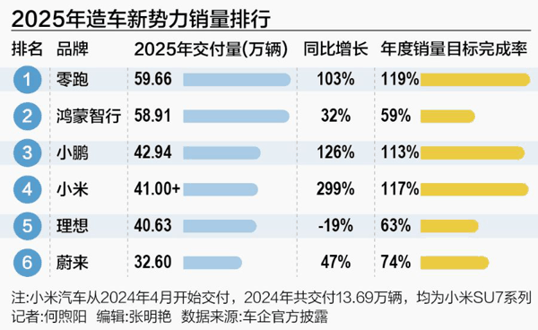 自2022年G9车型失利后,小鹏从侧重AI概念宣传转向务实产品打磨,2025年实现42.94万辆销量,成为“蔚小理”中唯一完成年度销量目标的企业。