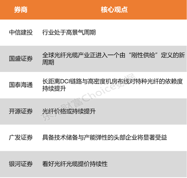 国盛证券 表示,光纤光缆价格变化为需求结构发生变化后的“供需敞口型”涨价。伴随 无人机 需求及AIDC光纤需求起量,高规格光纤产能紧缺,在供不应求的背景下,客户对价格不敏感,催生本轮陡峭的涨价曲线。开源证券指出,光棒具备扩产周期长、扩产难度大等特点,导致供不应求态势或持续,光纤价格或持续提升。