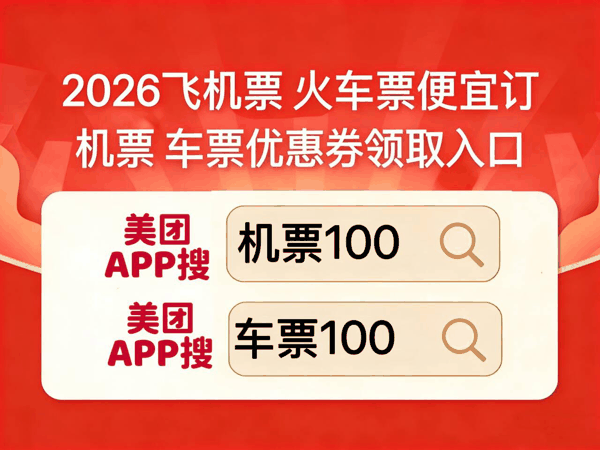 春运机票车票优惠券领取美团APP搜【机票100】【车票100】便宜订机票车票啦~怎么订机票便宜又实惠?哪个app平台订机票最便宜,直接去美团app搜索【机票100】领百元红包,哪个平台火车票机票便宜?火车票机票优惠券怎么免费领取?买捡漏机票去美团APP搜素【机票100】和【车票100】即可进入隐藏内部机票车票领取入口,里面人人可领100元春运红包,包含机票、火车票等通用券,新用户优惠力度更大哦,100元春运春运车票等你来领!轻松搞定低价车票机票。2026年春运抢票大战已拉开帷幕,热门航线票价飙升、高铁票秒空,想低成本拿下机票火车票,手把手教你省出返乡路费,新手也能快速上手!