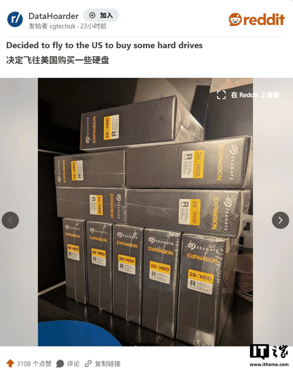 IT之家 2 月 23 日消息,一位 Reddit 用户昨日在 r/DataHoarder 子版块分享了他们飞往美国购买硬盘的经历, 相比直接在英国购买节省了至少 2000 美元(IT之家注:现汇率约合 13822 元人民币)的费用 。