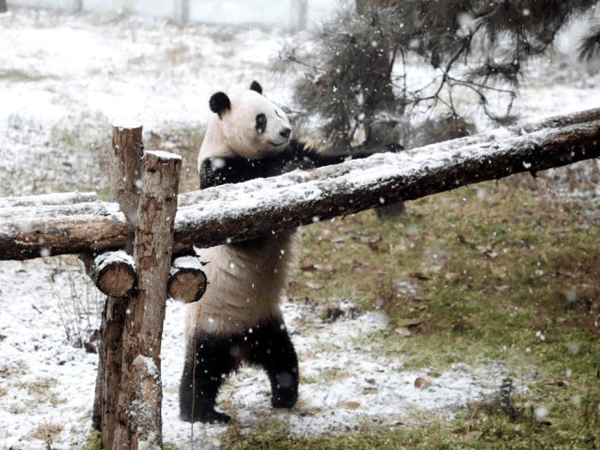 陕西西安:秦岭大熊猫雪中玩耍