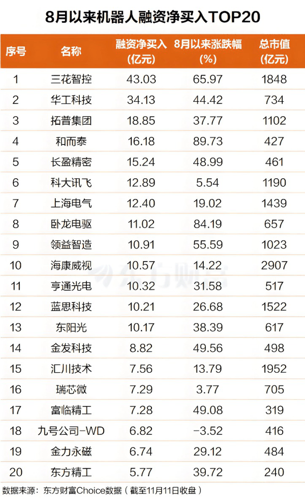 东方财富 Choice数据显示,8月以来,杠杆资金抢筹多只机器人板块概念股,其中 三花智控 排名第一,融资净买入超43亿元,8月以来涨幅接近66%; 华工科技 排名第二,融资净买入34亿元,8月以来涨幅超44%。