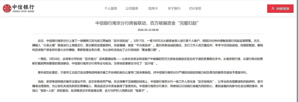 3月中旬,记者注意到 中信银行 南京分行成功拦截一笔100万元涉诈资金,并协助宁波警方将资金全额返还受害人,彰显了金融反诈的成效。