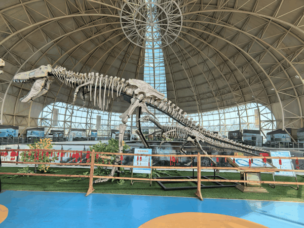 馆内的核心展品无疑是巨型诸城暴龙化石,这是白垩纪晚期亚洲大陆上当之无愧的“末代暴君”,体长约 11 米,站立高度约 4 米,体重约 6 吨,拥有锋利的牙齿与强劲的下颚,咬合力极强,是当时顶级的掠食者,主要以鸭嘴龙、角龙等植食性恐龙为食。 2025 年,这里还发现了长 1.21 米的暴龙股骨化石,刷新了亚洲暴龙类股骨长度纪录,进一步证实了诸城暴龙的庞大体型与强悍实力。此外,馆内还收藏了世界唯一大型带羽毛暴龙——华丽羽王龙化石骨架,这一发现颠覆了人们对暴龙体表无羽毛的传统认知,为研究恐龙向鸟类演化提供了重要线索。