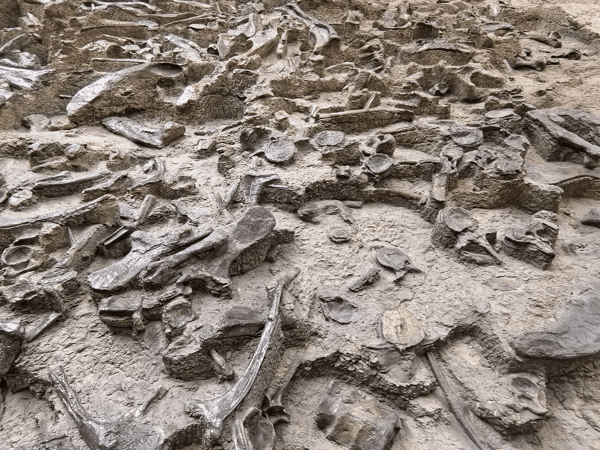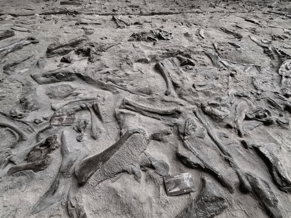 “这些化石不是零散分布的,而是见证了一场远古的‘集群灾难’。”讲解员的话语勾起了我们深入考察的好奇,结合现场地质剖面与专家研究成果,这场史前灾难的全貌逐渐清晰。经古脊椎所的同事研究证实,晚白垩世晚期,诸城地区气候发生突变,加之地质活动活跃,突发大规模泥石流或洪水灾害,大量恐龙在迁徙、觅食或饮水途中,被突如其来的泥沙迅速掩埋。由于掩埋速度极快,恐龙的遗体来不及被破坏,便完整保存下来,经过亿万年的压实、石化等地质作用,最终形成了如今规模宏大的化石长廊。而后期的地壳抬升与板块运动,让原本水平埋藏的化石层发生倾斜,形成了独特的 45 °斜坡景观,这种大规模、高集中度、保存完好的恐龙化石群,在全球范围内都极为罕见,是研究恐龙集群死亡原因、古气候突变、地质运动的天然实验室。