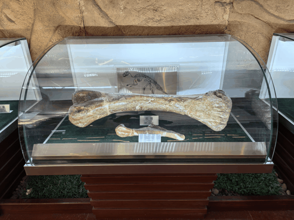 在展厅的角落,陈列着“巨大诸城龙”的股骨、脊椎、头骨碎片等标本,与完整骨架形成鲜明对比,让考察者能更细致地研究其骨骼结构与生长特征。其中一块股骨化石高 1.63 米,骨骼质地坚硬,结构清晰,历经亿万年依旧保存完好,足以见证当时恐龙的庞大体型。这件标本提供给访客驻足触摸,感受着亿万年时光的沉淀,而从科考角度来看,这块股骨化石的尺寸、密度、结构,都为研究鸭嘴龙的生长速度、体重支撑、运动方式提供了珍贵的实物资料,是解读大型植食性恐龙生理特征的重要依据。