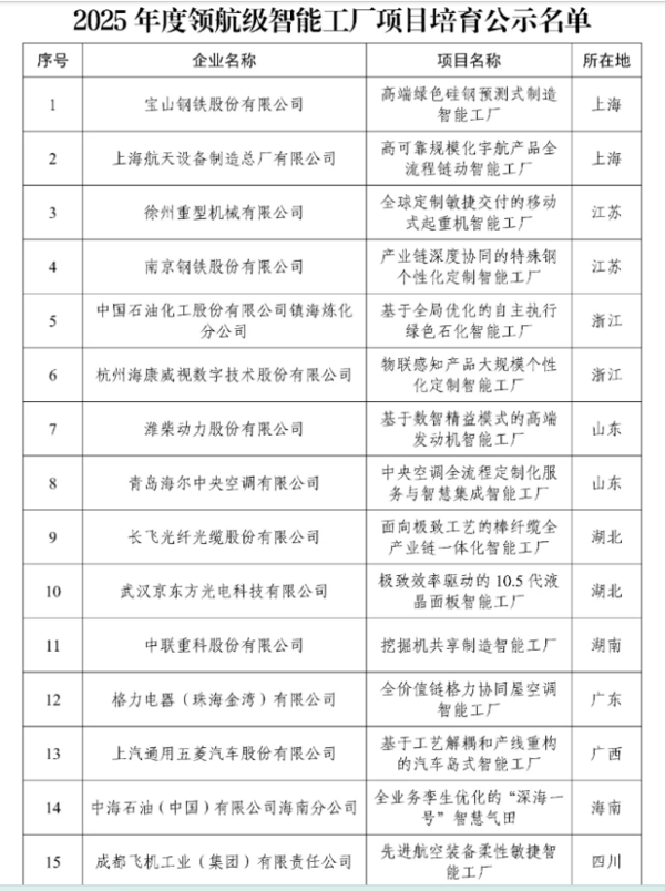 11月27日,2025世界智能制造大会在江苏南京开幕。由工业和信息化部牵头评选的首批15家“领航级智能工厂”在会上集体亮相,并共同发布“领航行动计划”联合倡议,以开放共享、协同创新、探索未来的行动和决心,加速构建具有全球影响力的智能制造新模式。15家上榜公司中,有6家位于长三角地区,其中,江苏两家上市公司 南钢股份 、 徐工机械 的智能工厂成功入选。