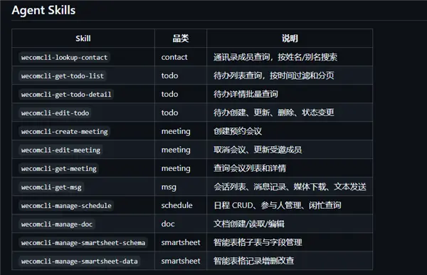 安装:安装CLI(npm install -g @wecom/cli),安装CLI SKILL(npx skills add wecom/cli -y -g)