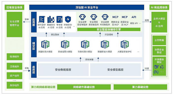 深信服通过AI安全平台建立起 面向「AI+安全」时代的全域安全智能中枢 。平台以统一 “安全数据和模型底座” 为核心,原生集成流量检测、安全运营、钓鱼防护、 数据安全等场景化安全大模型,实现从 “AI增强单点技术” 到 “AI赋能安全体系” 的渐进式升级,帮助用户构建智能融合、化繁为简、实战有效的 “AI安全能力池” 。