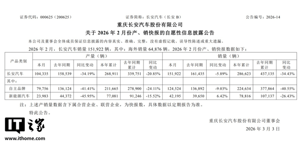 IT之家 3 月 2 日消息,长安汽车今天在公众号平台宣布 2026 年 2 月销量 151922 辆,环比增长 12.8%。