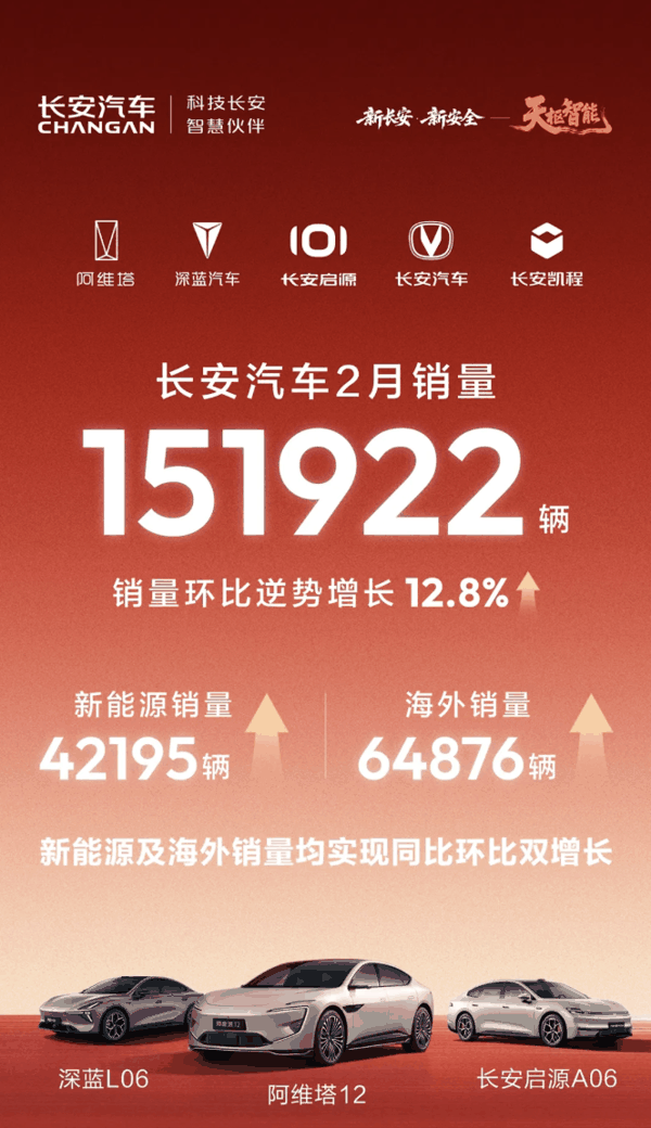 长安汽车2026年2月销量151922辆:同比下降5.89%,环比增长12.8%